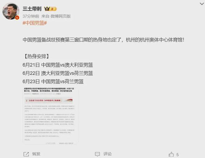 与此同时,中国男篮公布了热身赛对手,6月21日对阵澳大利亚男篮;6月22日澳大利亚男篮对阵荷兰男篮;6月23日中国男篮对阵荷兰男篮。今夏7月份的世预赛第三窗口期,中国男篮将再次迎战日本男篮和中国台北队。