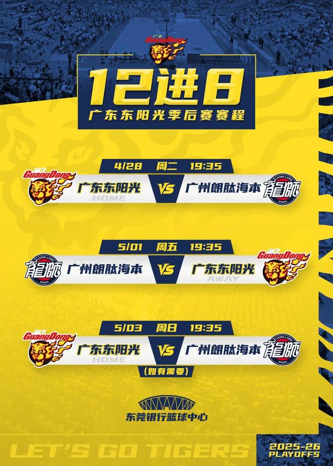 4月28日,CBA季后赛12进8比赛首回合,广东东阳光将坐镇主场迎战广州朗肽海本男篮。双方在常规赛有过2次交锋,华南虎保持全胜。
