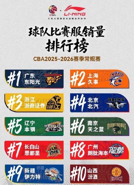 球队球衣销量榜前十:广东、上海、广厦、北京、辽宁、南京、吉林、广州、新疆、山西。