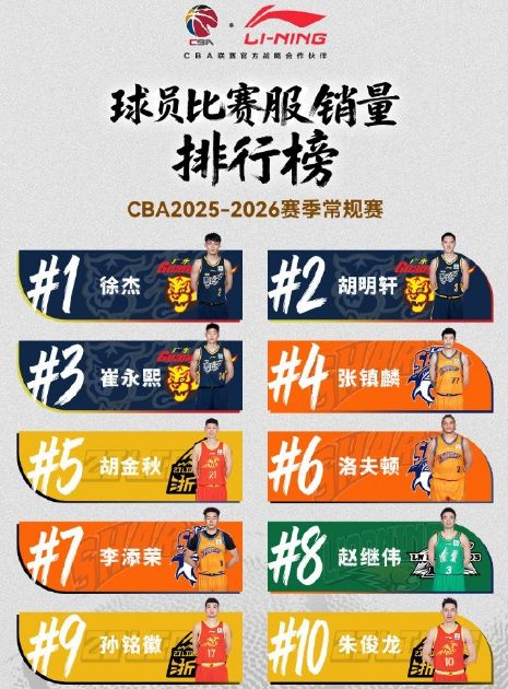 球员球衣销量榜前十:徐杰、胡明轩、崔永熙、张镇麟、胡金秋、洛夫顿、李添荣、赵继伟、孙铭徽、朱俊龙。