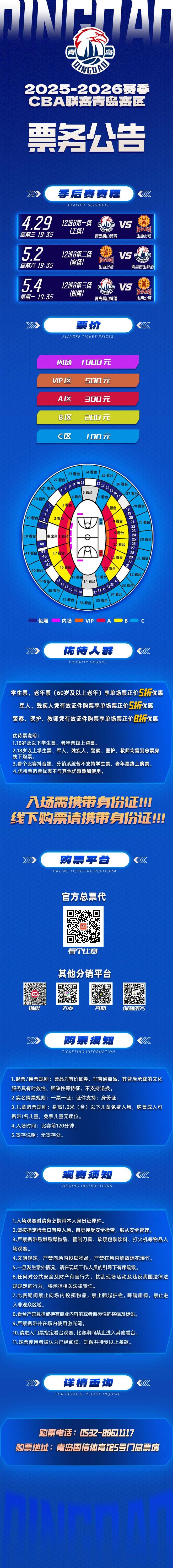 明晚19:35,2025-2026赛季CBA联赛季后赛12进8第1场,青岛崂山啤酒主场迎战山西汾酒。强强狭路相逢,对决悬念拉满,每一秒都将是热血较量,青岛崂山啤酒将全力出击,为球迷朋友奉献高水准对决!欢迎球迷朋友来现场为我们的主队加油助威,大家可以也锁定CCTV5、抖音、青岛电视台三套观看比赛直播。